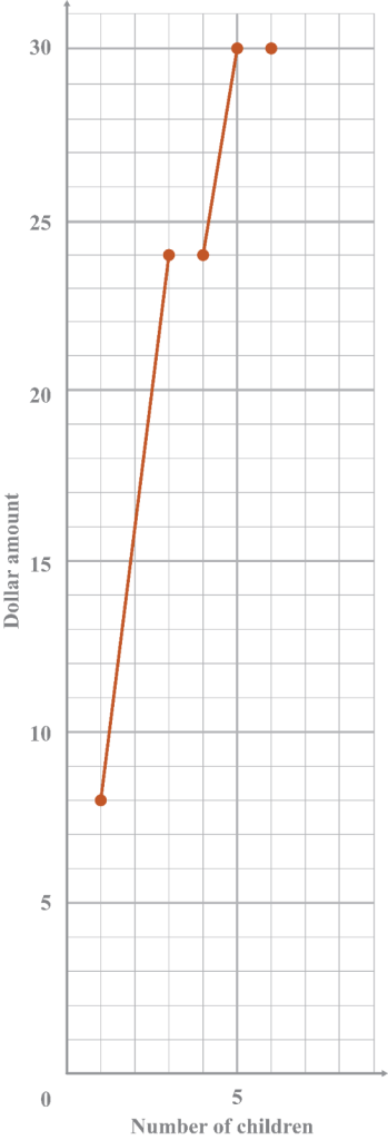 Gracie’s Babysitting charges different amounts depending on the number of children. She babysits for one hour. If there are 1–3 children, she charges $8 per child. If there are 4–5 children she charges $6 per child. If there are 6 children, she charges $5 per child.