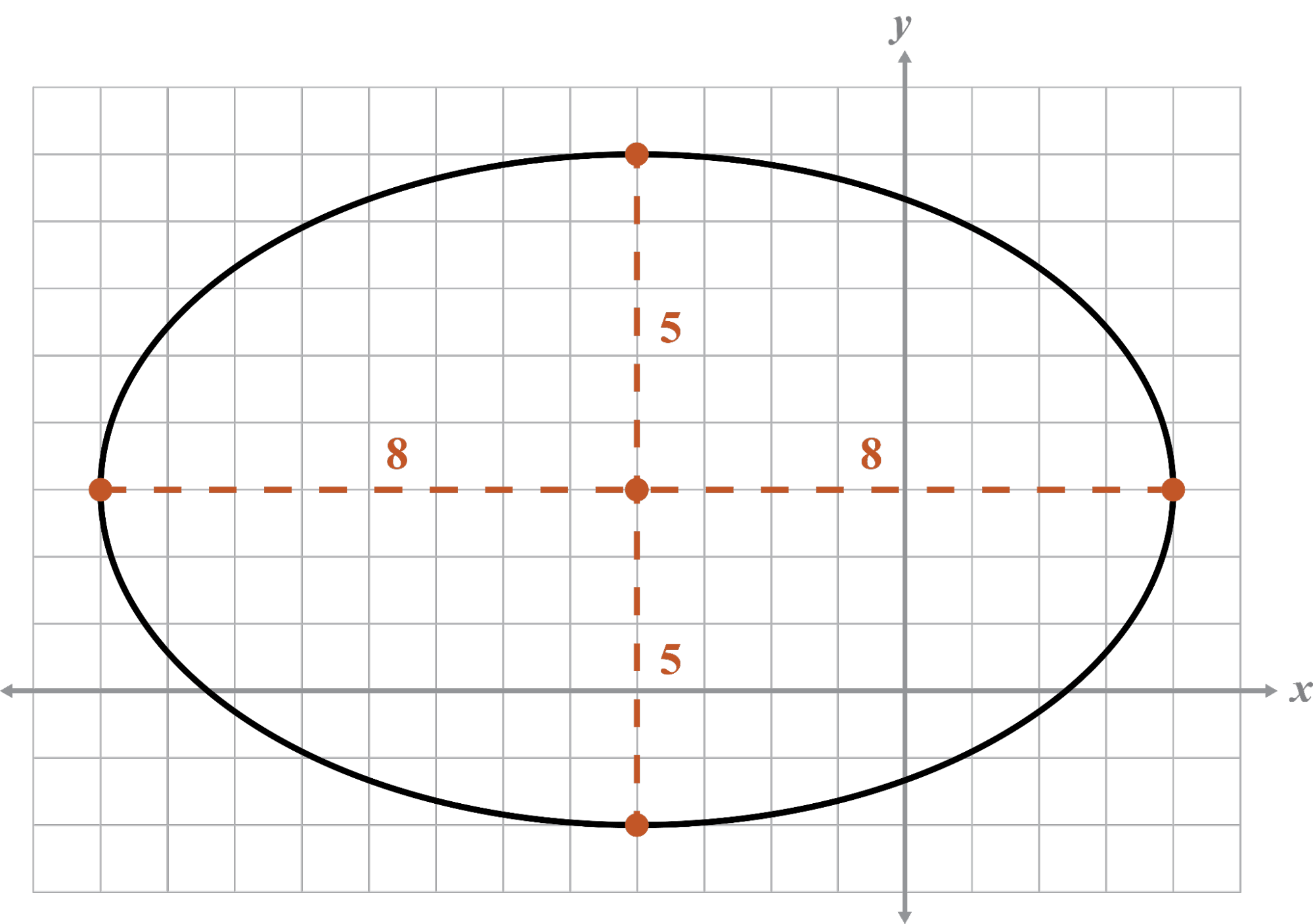 It is possible to graph an ellipse along a slant axis (not aligned with either the x‐ or y-axis). Ellipses with slant axes are not covered in this level.