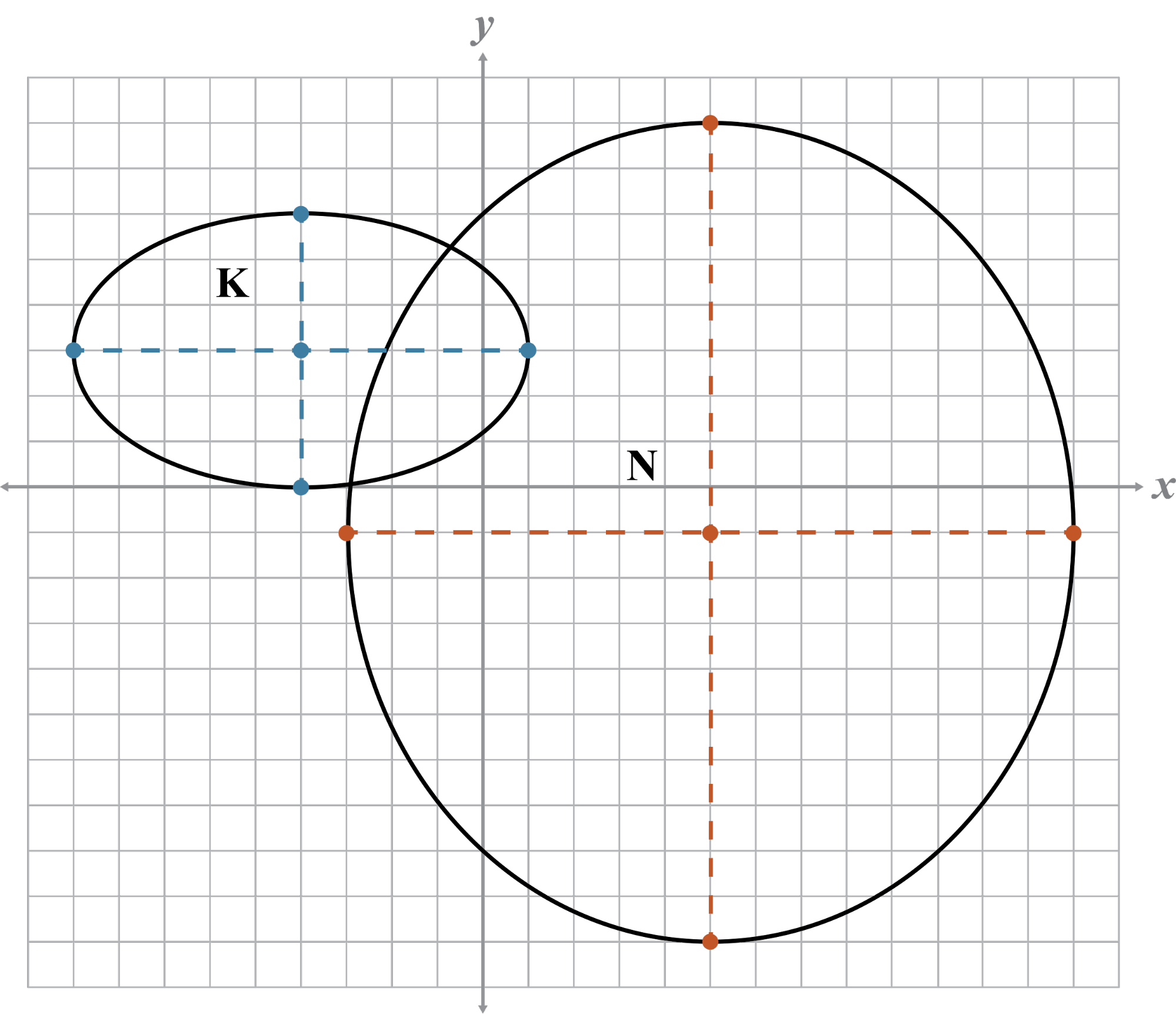 Write the equation of ellipse K and ellipse N. Name the co-vertices of ellipse K and the vertices of ellipse N.