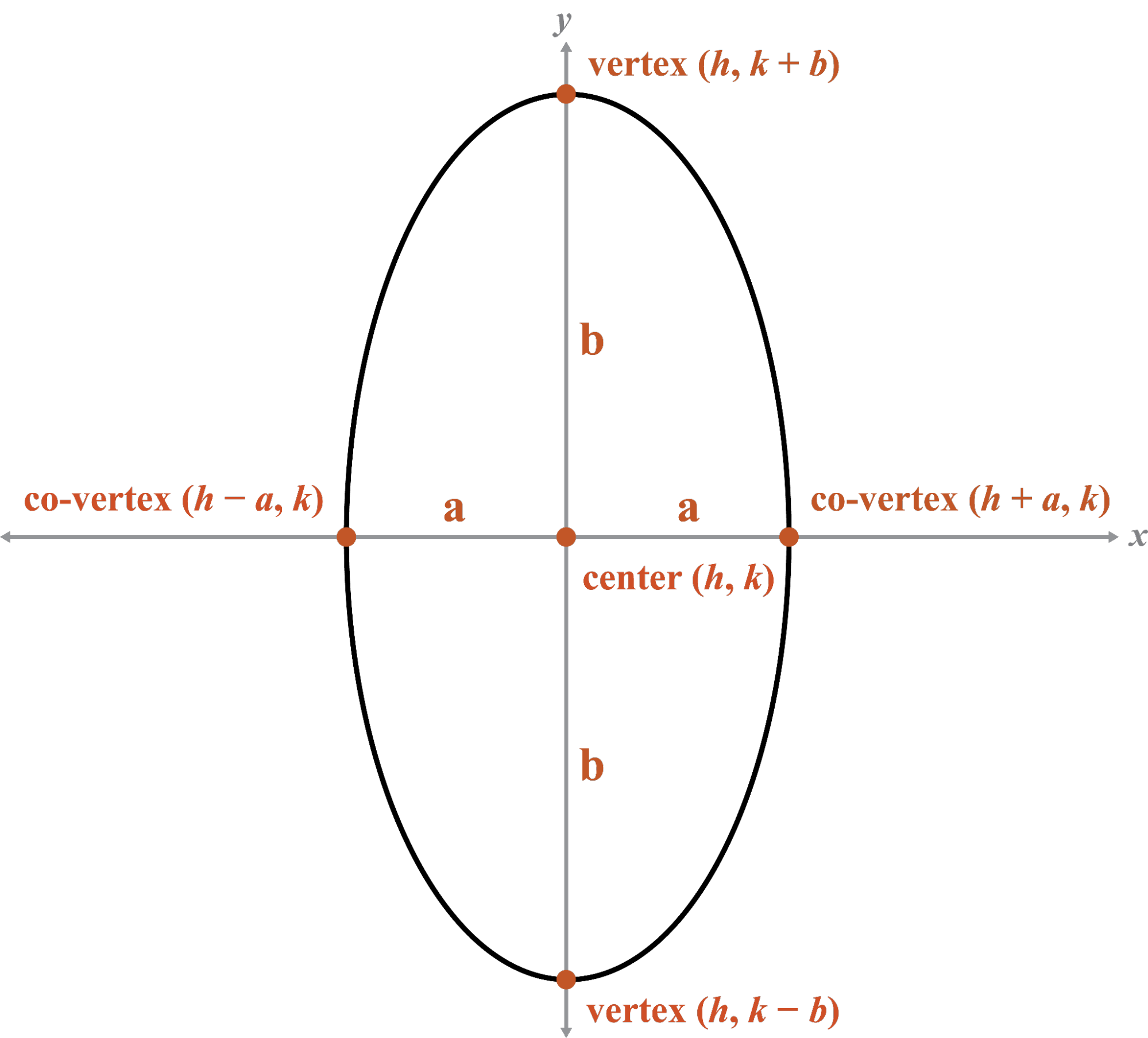 - Co-vertices are where the ellipse intersects the minor axis.