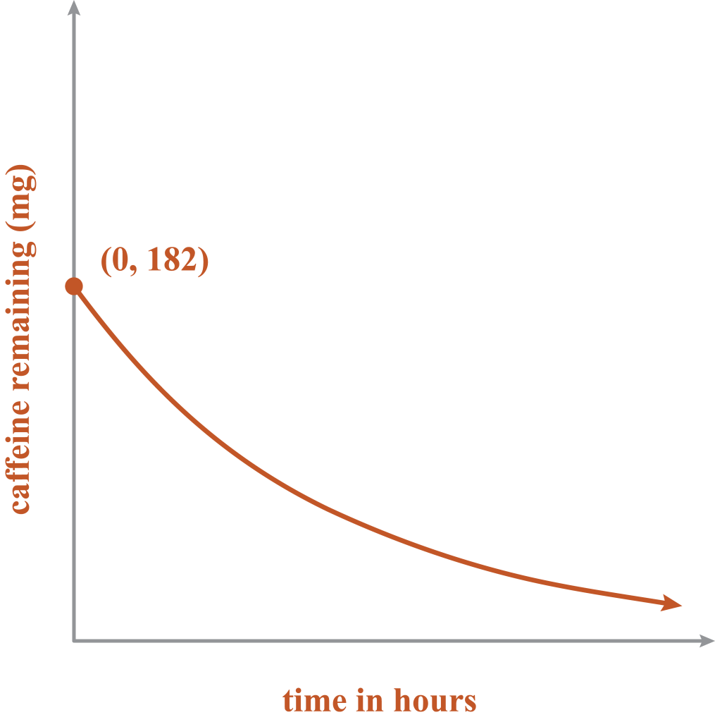 At 8:30 a.m., Douglas drinks a 16 ounce coffee containing 182 milligrams of caffeine. He knows the half-life of caffeine in regular coffee is about five hours. He found a formula that approximates the amount of caffeine in his system at any time: