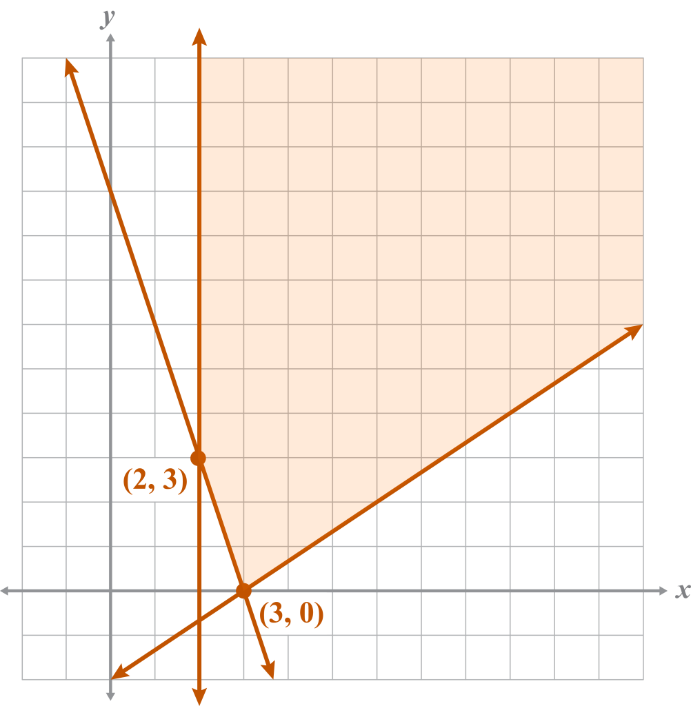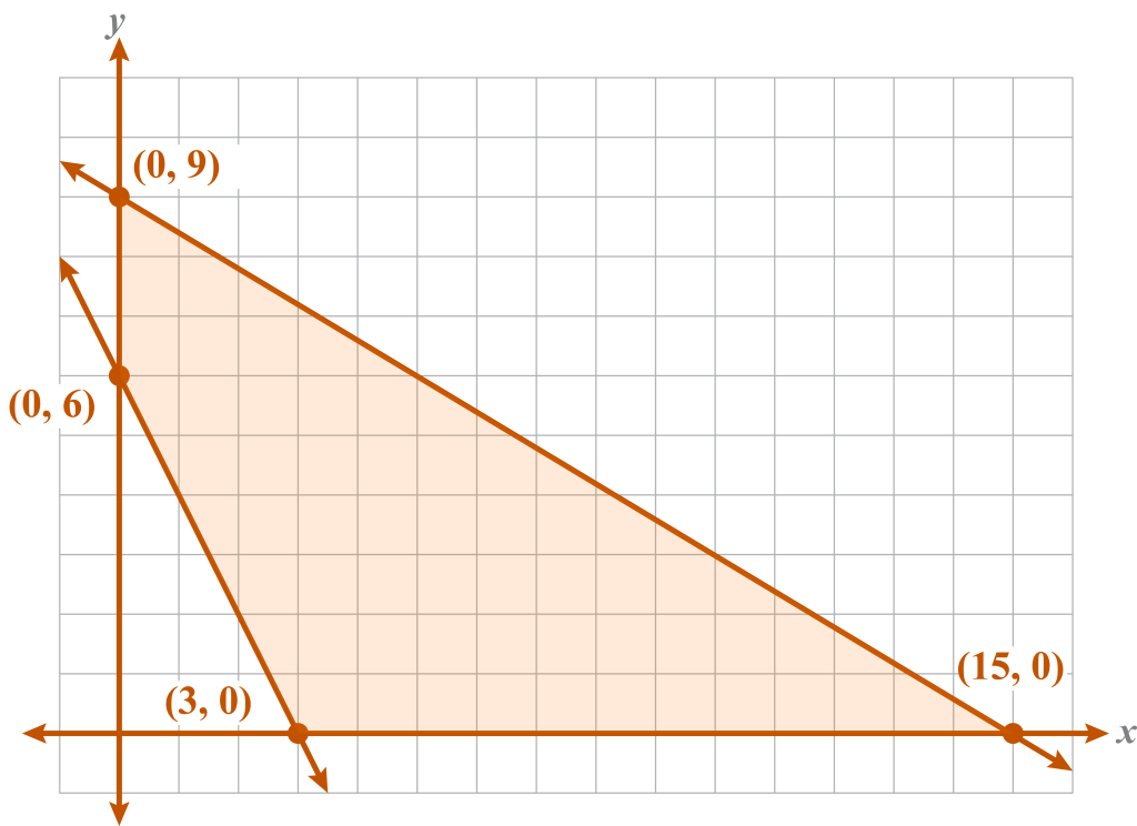 This problem has one minimum at (3, 0). This system is unbounded, so there is no maximum.
