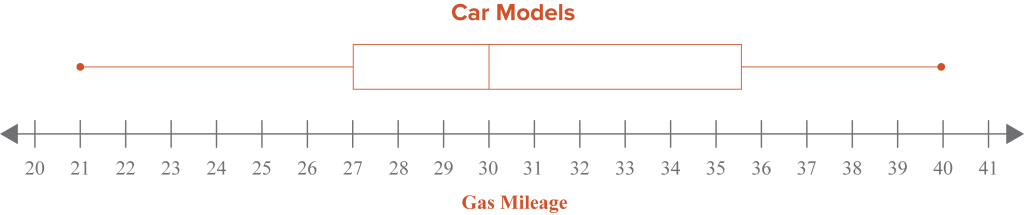 1. A car company listed the miles per gallon ratings for ten different car models. The data set for the gas mileage of each car model: 32, 40, 36, 35, 26, 21, 30, 28, 30