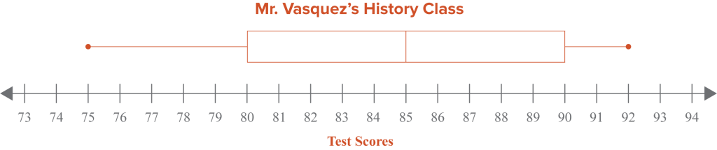1. Mr. Vasquez’s history class made the following scores on his latest test:75, 80, 90, 87, 92, 77, 85, 80, 85, 90