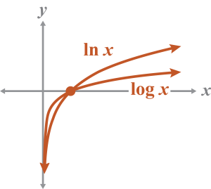 The common log is steeper than the natural log and both have an intercept at the point
